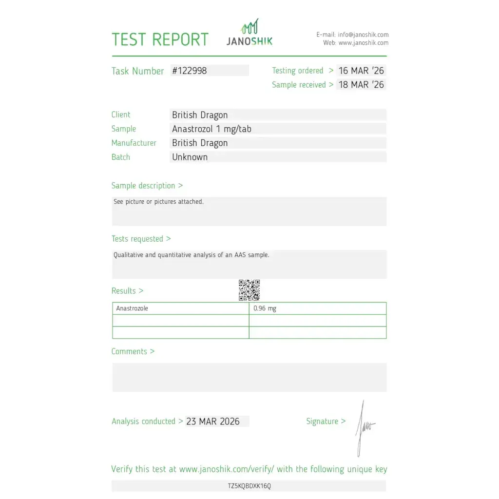 Notes:To control the level of estradiol, Anastro-Lab (A-dex) is used, which excludes such side effects as gynecomastia, water retention, etc.
